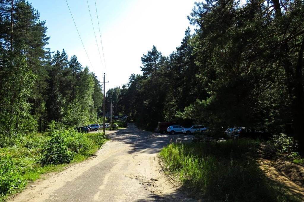 На развилке поворачивайте направо. За деревьями крутой поворот вниз. Съезжайте с горы и паркуйте машину на поляне. Дальше лучше пешком, благо, недалеко — всего метров 500.