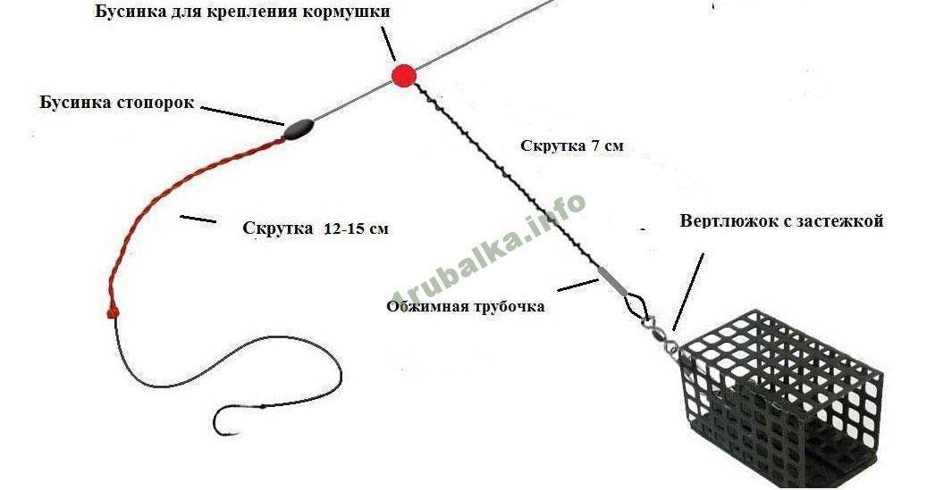 После чего связать петлю и соединить поводок. Эта конструкция производится благодаря скользящему монтажу. Это обосновывается тем, что кормушка движется по основанию лески, при этом наличие препятствий исключается.