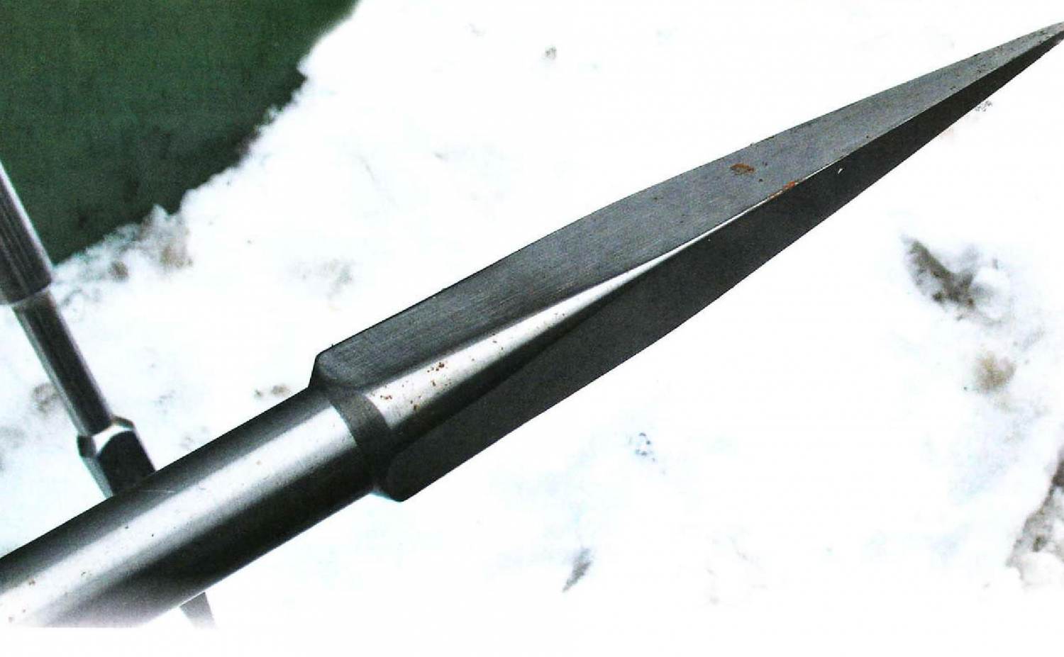 При изготовлении самодельной пешни также важно учитывать угол наконечника. По этому параметру определяется точность и качество вхождения лезвия в лед, скорость рубки прорубей и интенсивность затрачивания сил