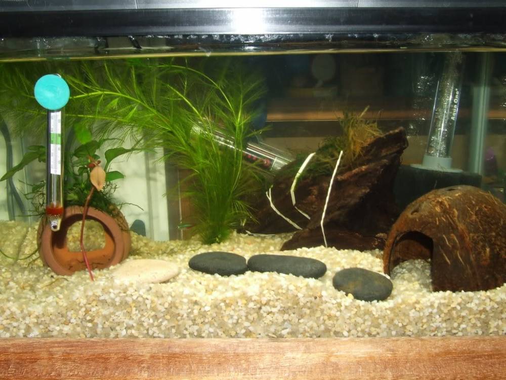 После этого на дно помещаются украшения — коряги, горшки, домики и т. д. Затем аквариум заливается водой наполовину, и только теперь можно высаживать растения. После посадки можно долить воду, отступив от кромки 2 см.