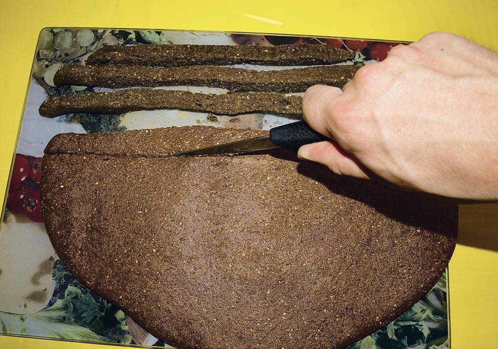 Измельчить льняные, конопляные семечки и просо, добавить к получившемуся порошку соевую муку (2 стакана), рыбную муку (4 стакана), пшеничную муку (1,5 стакана), замесить крутое тесто, добавляя яйца, пока тесто их берет.