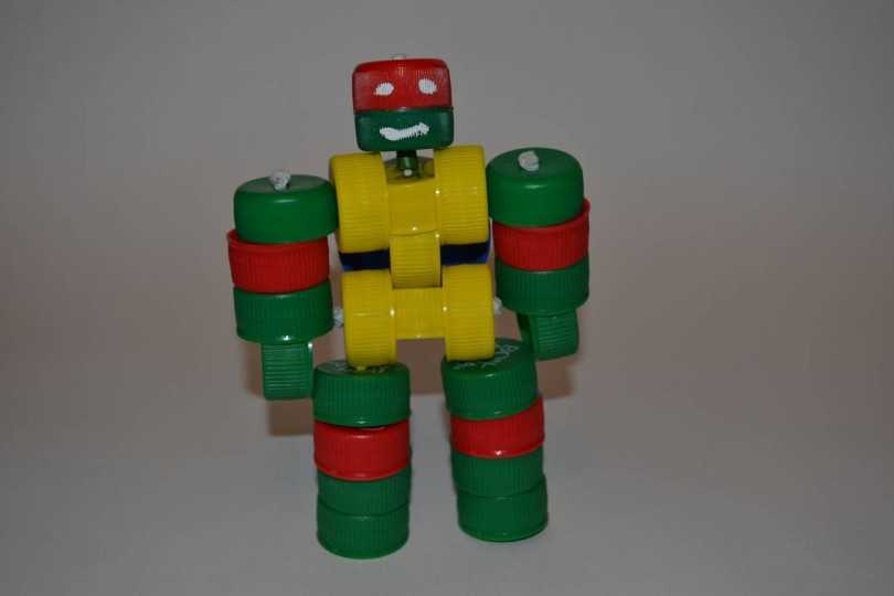 Для маленьких фантазеров делаем робота из пробок от бутылок. Здесь достаточно иметь одного цвета материал, шило для дырок, плотную леску. Робот собирается всего из 24 крышек, из них по 4 на ноги и руки, остальные используем для туловища и головы.