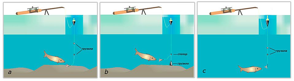 В первом варианте достаточно сдвинуть поплавок ближе к вершинке удилища, так чтобы он оказался над водой и, возможно, добавить грузило, если имеющегося недостаточно. Грузило желательно ставить легкосъемное, чтобы можно было легко вернуться к поплавочному варианту снасти. Примером таких грузил могут быть свинцовая пластинка или легкая кормушка с безузловым соединением. Как правило, такое переоснащение происходит прямо на рыбалке.