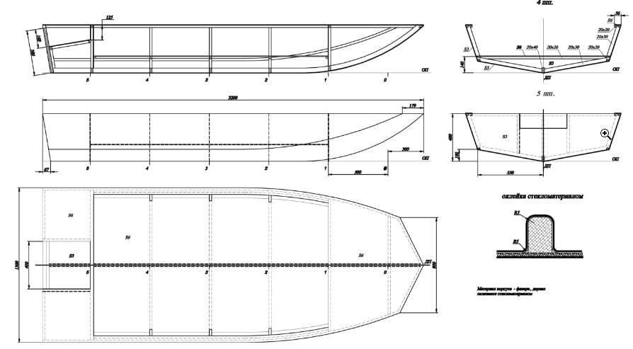 Для матрицы потребуется достаточно плотная двухслойная фанера (порядка 1,2 см в толщину) — это необходимо для обеспечения жесткости будущего изделия и особенно важно для бортов. Сначала надо изготовить по выбранному чертежу каркас (он не должен быть маленьким — технология требует крупных размеров лодки), а затем начать прикреплять на него шпангоуты — ребра корпуса судна, — киль и другие детали