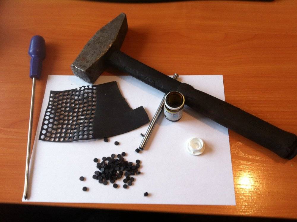 Вырезать правильные круглые дырочки на коже или джинсе — не простая задача, если вы не костюмер или портной. Тем не менее нам на помощь придет обычный дырокол, который в обилии водится на заповедных территориях офиса или канцелярского магазина. После прокалывания, ложе должно быть похоже на вторую картинку снизу.
