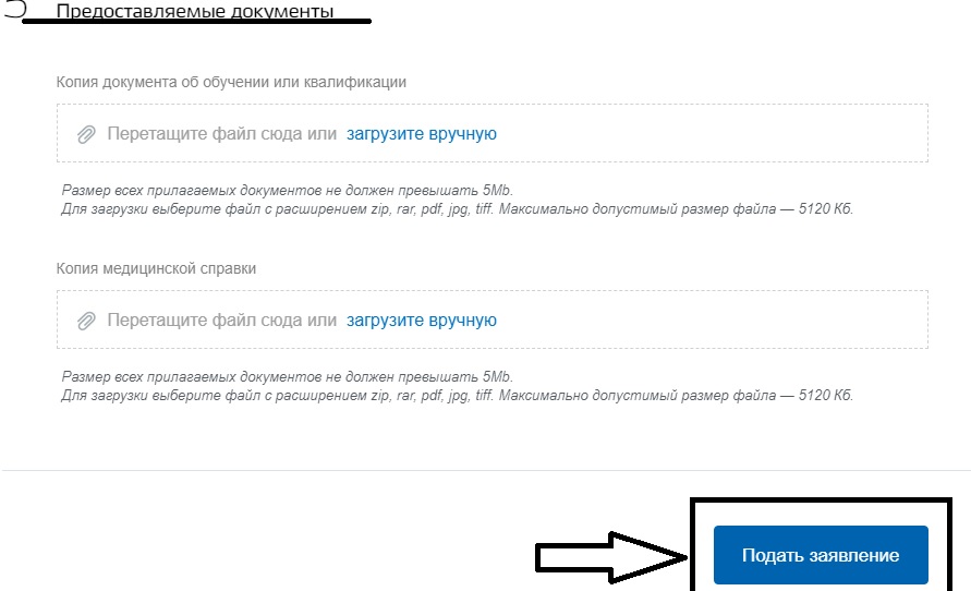 Шаг 5. В конце необходимо загрузить запрашиваемые документы. А именно копию о получении квалификации и копию медицинской справки. После этого нажать на клавишу «Подать заявление».