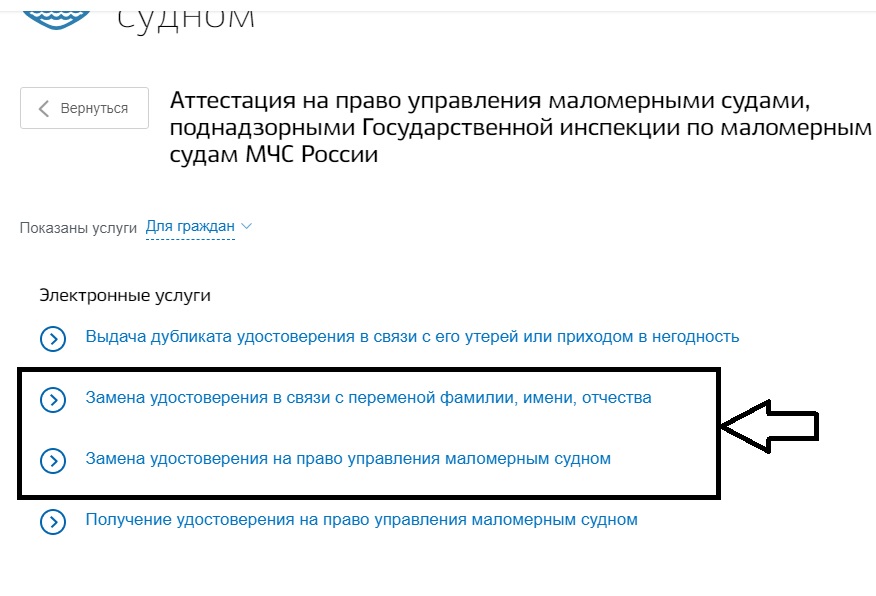 Шаг 3. Если замена удостоверения производится по причине смены ФИО, то необходимо выбрать соответствующий пункт. Если причина иная, то необходимо выбрать «Замена удостоверения на право управления маломерным судном».