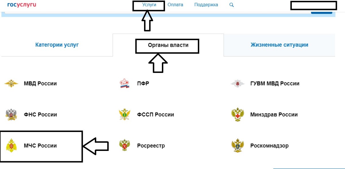 Шаг 2. Далее необходимо зайти в раздел «Услуги» и выбрать категорию «Органы власти», в открывшемся окне перейти в раздел «МЧС России».