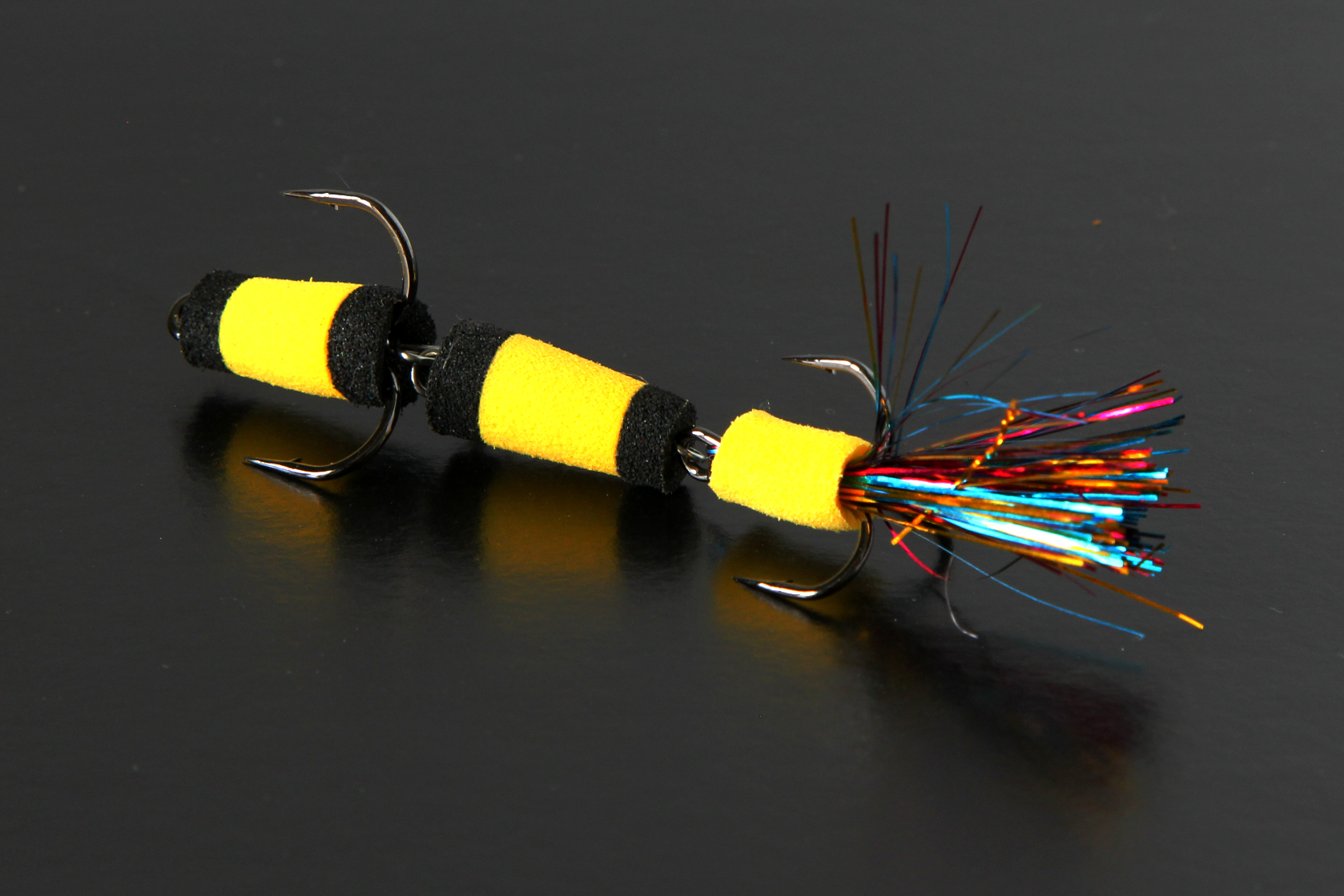 - Закрепляем опушку на заднем тройнике, для этого пучок нитей люрекса, складываем вдвое и пропускаем через ушко тройника, обрезаем лишние кончики люрекса ножницами. Для большей надежности крепления опушки, можно обмотать цевье тройника плетеной леской и пропитать ее суперклеем. Затем на цевье тройника надеваем пенополиуретановую заготовку.