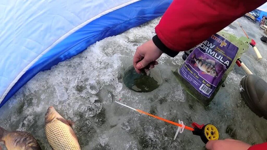 В основу смеси входит опарыш, которого следует заранее окатить кипятком. В лунку подаются небольшие порции корма. Ловля карпа зимой тут.
