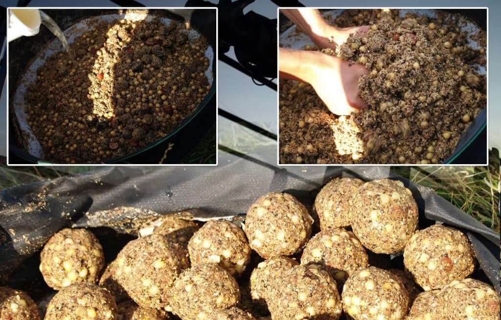 Уже на водоёме все составляющие перемешиваются, добавляется грунт и вода небольшими порциями. Делаются шары, размером с яйцо и доставляются в точку лова.