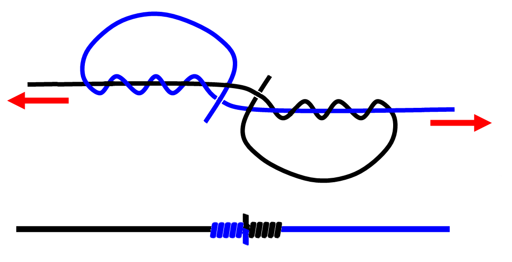 Возьмите два конца лески и соедините их друг с другом. Обмотайте один конец лески вокруг другого. Необходимо сделать не меньше шести аккуратных оборотов, после чего вернуться в начало обмотки и продеть конец наматывающей конца между лесками. После чего наматываем второй конец лески вокруг первого. Возвращаемся в начало обмотки, протягиваем конец между лесками. Узел готов, вам остаётся только затянуть.