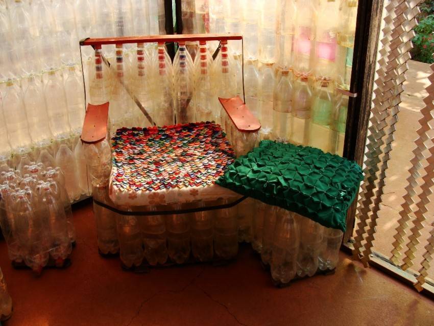 Для полного изготовления кресла понадобилось собрать примерно 90 бутылок, скрепляли их между собой на скотч, а сверху накрыли стрейч-пленкой. Рассказать о всём процессе сборки кресла не получится, на момент написания статьи кресло было в готовом виде.