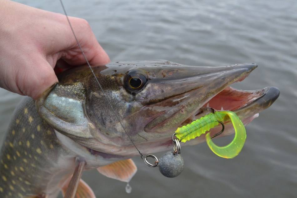 Для щуки применяют крупные твистеры длиной не менее 10 см одеваемые на джиг-головки массой 15-20 грамм, с широкими хвостами.