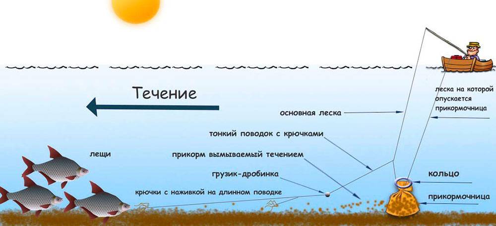 Самый уловистый способ ловли в таких условиях на кольцо, или подпуска с использованием лодки. Принцип ловли не хитрый, – большая кормушка с ароматной кашей, от которой идет подпасок с 2-3 поводками с опарышем, червем, или просто шариками пенопласта. Главное, чтобы каша хорошо вымывалась, привлекала и удерживала рыбу на месте долгое время. Если найти большую стаю и изготовить правильно снасть, дневную норму улова превысить легко за несколько часов.