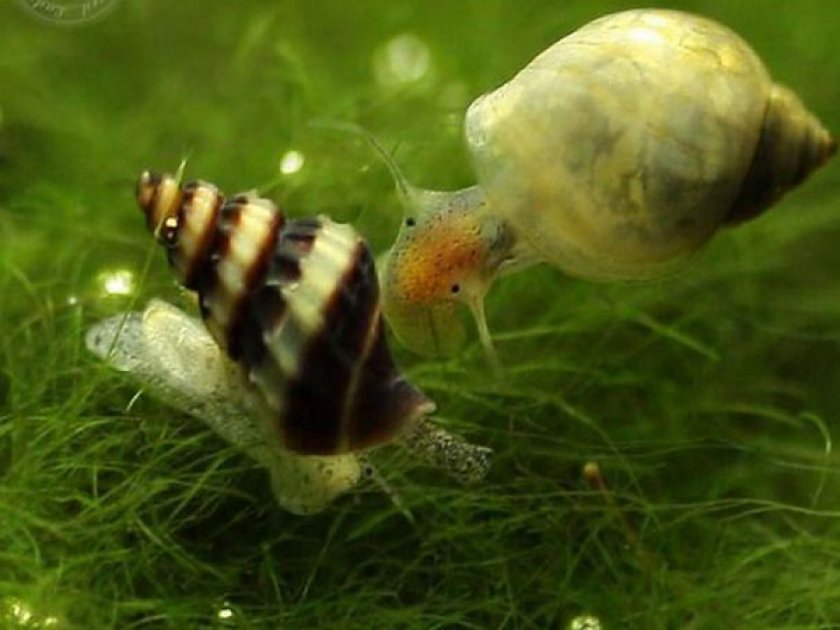 Неретина зебра (тигровая улитка), неретина ежик, неретина черное ухо. Они удаляют налет со стекол, камней, коряг, декора и крупных листьев, не повреждая их. Создается впечатление, что они никогда не устают. Минус – оставляют на стекле аквариума неэстетичные кладки икры, из которой не проклевывается молодь.