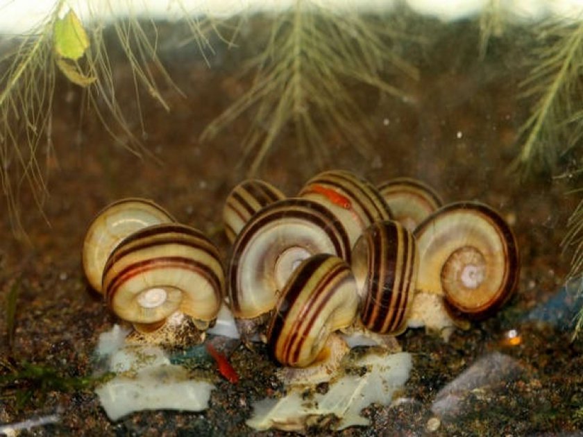 Аквариумная улитка мариза. У нее раковина подобна катушке, но по всей длине проходят темные полосы. Улитка довольно крупная и прожорливая. При этом растения находятся в зоне риска. Брюхогнога следует регулярно подкармливать. Полосатая аквариумная улитка раздельнопола, любит теплую воду и регулярно совершает побеги.