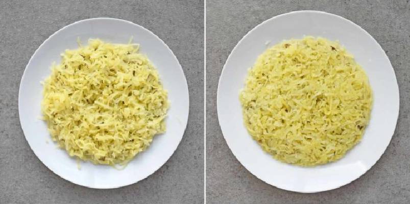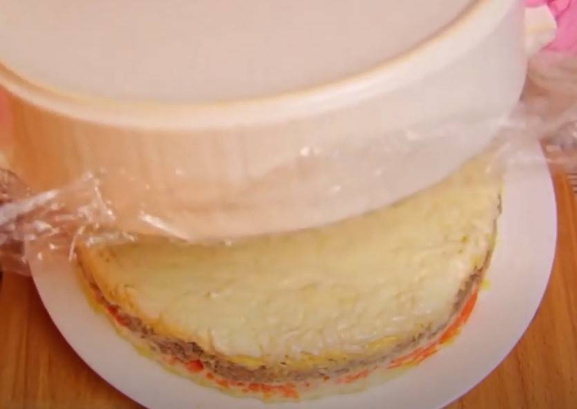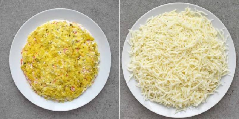 8. Трём небольшой кусок моцареллы на мелкой терке и равномерно распределяем по салату. Слегка уплотняем вилкой и смазываем 3 столовыми ложками майонеза.