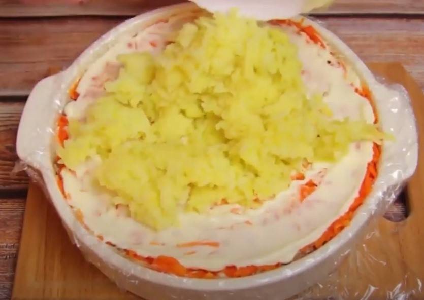 Слоёный салат Мимоза с рыбой, картофелем и сыром