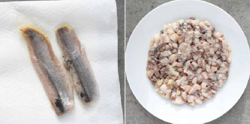 3. Вынуть из упаковки 2 ломтика сельди и выложить на тарелку, застеленную бумажным полотенцем. Промокните сельдь бумажным полотенцем, чтобы удалить излишки масла. Нарезать мелкими кубиками.