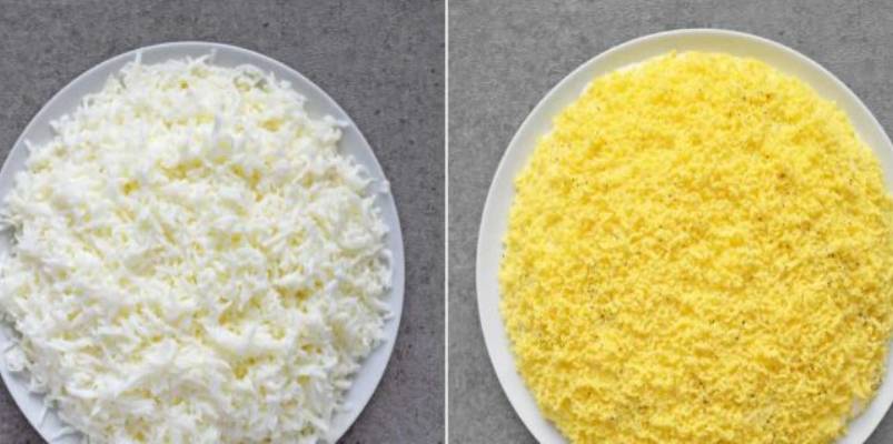 - Сваренные вкрутую яйца очистите, по отдельности натрите желтки и белки.