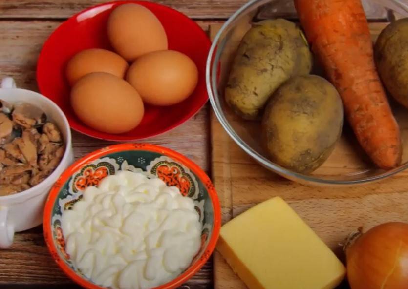 А теперь хочу рассказать как в этом салате мы использовали маринованную сельдь. Очень понравился соленый и острый вкус сельди в сочетании с овощами и сыром. Основные ингредиенты — сыр, яйца, рыба, лук и майонез. Мы также добавляем картофель, морковь для контраста и вкуса, и немного соленых огурцов, чтобы сделать его чуть-чуть хрустким и немного острым.