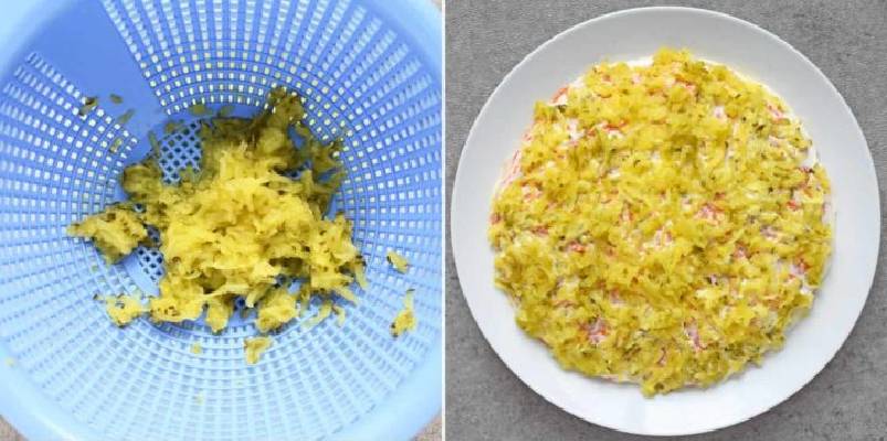 7. На сито откидываем очень мелко нарезанный или натёртый солёный огурец, чтобы скапал лишний сок, можно слегка ложкой отжать. Равномерно распределяем массу по моркови.