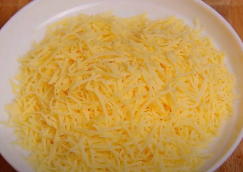 - Сыр из полутвердых сортов натереть на мелкой терке, после чего добавить его к остальным ингредиентам.