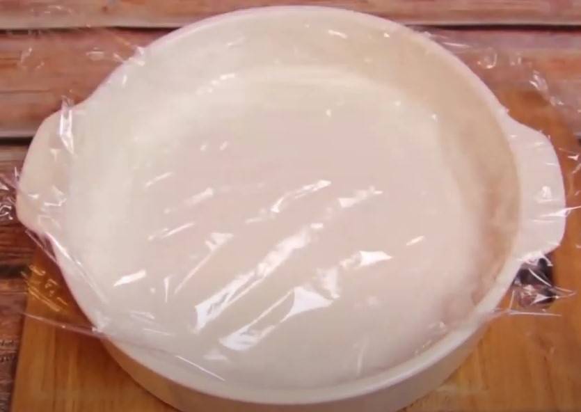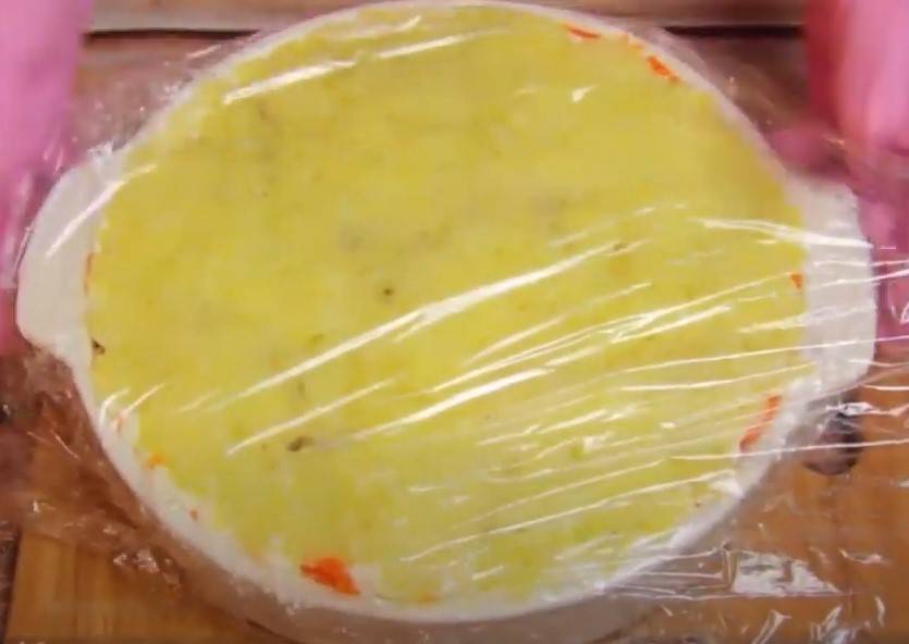 10. Сверху выкладываем 3-4 измельчённых желтка. Можно добавить измельчённую свежую петрушку, посыпаем молотым черным перцем. Накрываем пищевой пленкой и ставим в холодильник до подачи.