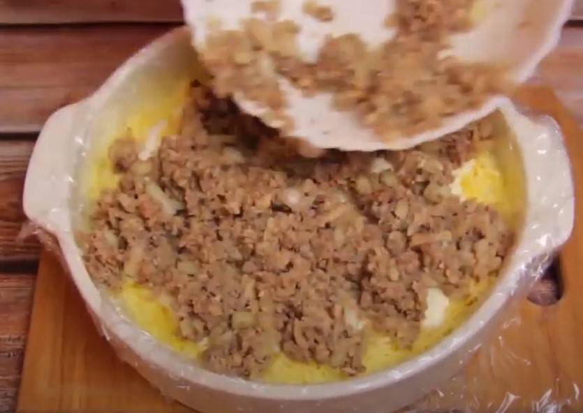 - На рис выложите размятые вилкой консервы, лук. Сделайте майонезную сеточку.