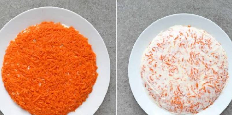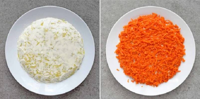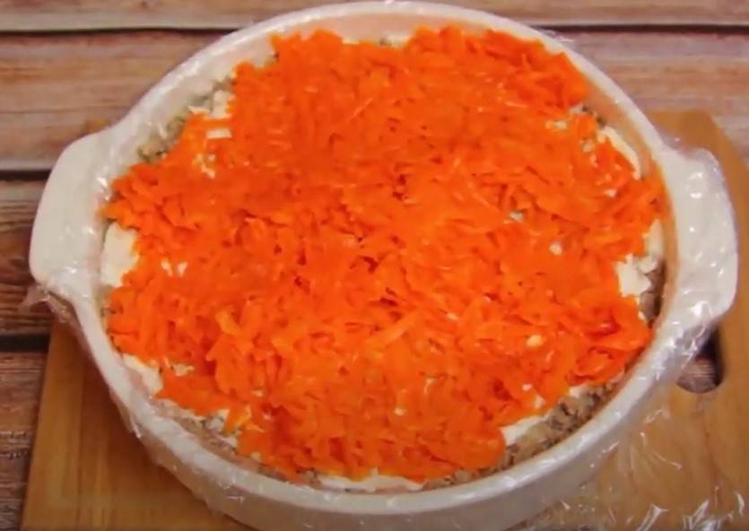 6. Также, мелко натереть 1 среднюю морковь поверх салата, слегка уплотнить.