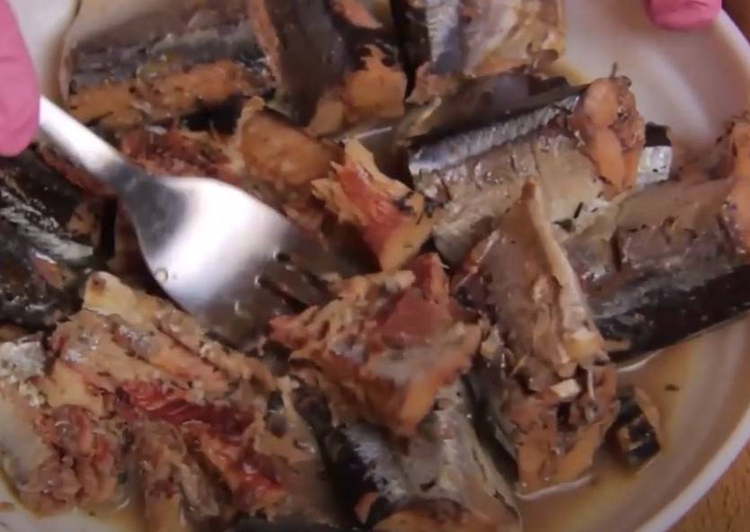 - Консервированную рыбу отделить от масла и прочей жидкости. Далее в банке измельчить ее вилкой. Главное – не порезать руки об банку. После чего добавить ее к ранее заготовленным ингредиентам.