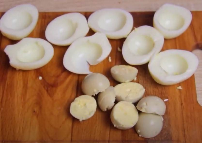 - Перепелиные яйца необходимо очистить и разрезать на несколько частей.