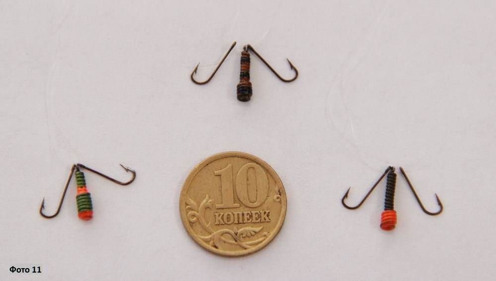 В последние зимние сезоны не перестаю удивляться так называемыми микробалдами. Это особенная разновидность обычной Балды, их тело схоже с популярными ныне безмотыльными мормышками и дополнено двумя крючками. Леска для ловли на микробалду подойдет достаточно тонкая – 0,1 – 0,13 мм, подходящие крючки – №№ 18 – 14. «Подвески» в виде кембриков, бисерин и т.п. в этом случае я не использую (фото 11) – приманка и так работает отлично. Для передачи самой аккуратной поклевки кивок подбираю из лавсана в зависимости от веса приманки.