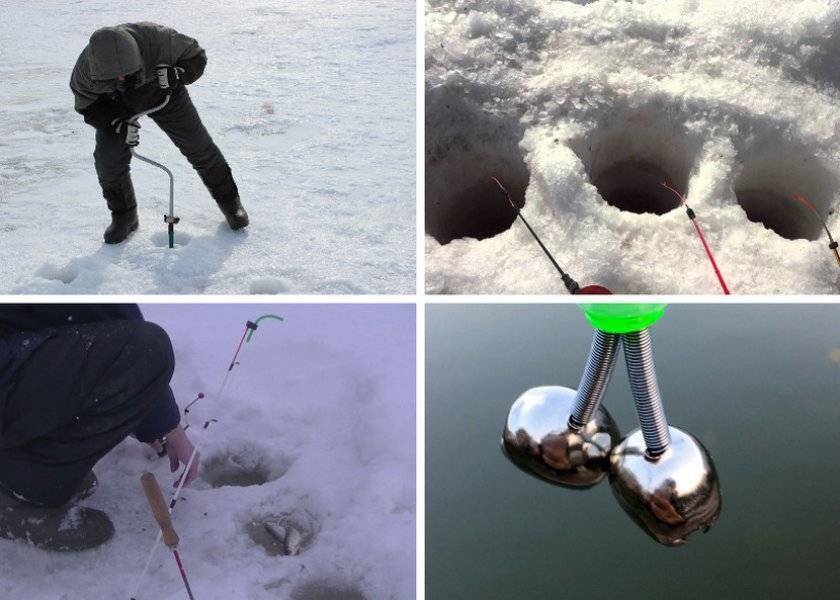 Для этого подойдет эхолот либо флешер, который позволит изучить состояние дна. Можно воспользоваться глубиномером либо «прозвонить» участок удильником с катушкой и привязанным на конце лески ушастым грузилом. Затем сверлятся лунки с интервалом 20–25 метров в шахматном порядке. В них устанавливаются вертолеты. Применять больше 5–6 снастей нерационально.