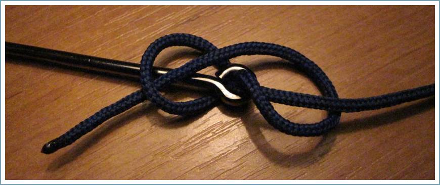 Прежде чем завязывать узел, необходимо продеть рабочий конец в ушко крючка, если, конечно. такое входит в комплектацию оснастки. В случае с лопаткой, ласка будет проводиться параллельно линии цевья. После того как этот этап будет выполнен, нужно сделать петлю свободную, не затягивая с большой силой, рабочий конец после этого обернуть вокруг линия цевья не менее 7 раз для большей надёжности.