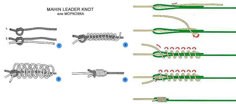 Рыболовный узел морковка. Это излюбленный вариант сторонников фидерной ловли, ведь благодаря своему размеру и форме такой узел с легкостью проскальзывает через заводные кольца удилища. А еще он подходит для самых разных материалов и сочетаний. Например, обычной и флюорокарбоновой, монофильной и плетенки, лесок разного диаметра (крепление шок-лидера). Правильно связанная и хорошо затянутая «морковка» не намного толще самой лески. Вяжут ее так: два конца складываются в направлении друг к другу, один из них завязывается свободным узелком на другом на расстоянии от края примерно 20-25 см, этим куском нужно обвить первую леску в обратном направлении (до 10 оборотов), а потом вставить его конец в узелок, который завязывался в самом начале. Затягивать «морковку» необходимо одновременно за обе лески, торчащие кончики можно обрезать. Некоторые рыболовы покрывают такой узел водостойким клеем для придания ему гладкости.