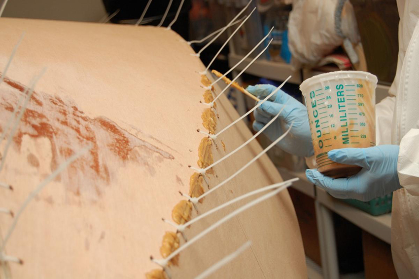 - После высыхания на гелькоут укладываются заранее раскроенные заготовки из стекловолокна. Это армирующий наполнитель, при раскрое которого потребуется применение шаблонов. При креплении стекловолокна необходимо обработать заготовки смолой, нанося ее малярным валиком.