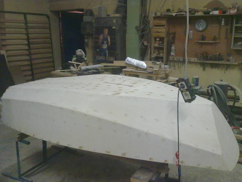 - Затем устанавливаются бортовые элементы, в них делаются вырезы под стрингеры и ставятся сами элементы жесткости, после этого можно приклеивать и прикручивать саморезами фанеру для бортов. Соединения изнутри для дополнительной прочности промазываются эпоксидной смолой и закрываются одним слоем стеклоткани;