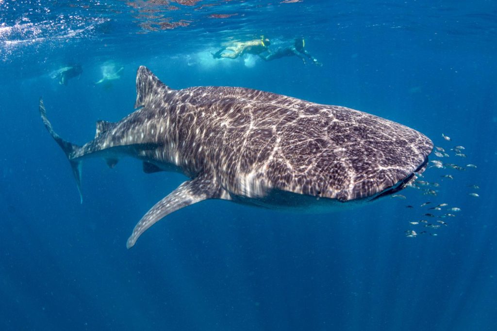 Хищная рыба может весить до 2,5 т при длине тела в 15 м. Такие огромные китовые акулы не могут быстро передвигаться, максимальная скорость – 5 км/ч. Рацион питания состоит из планктона. К людям относятся мирно, даже позволяют проплыть у них на спине, катают их.