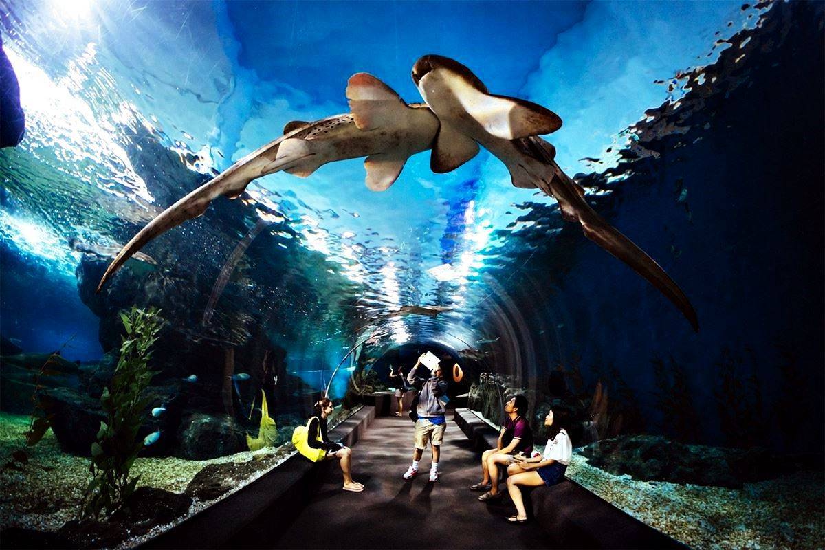 Посетители могут пройти по почти 100-метровому стеклянному туннелю, окруженные со всех сторон самыми разными рыбами и другими морскими обитателями.
