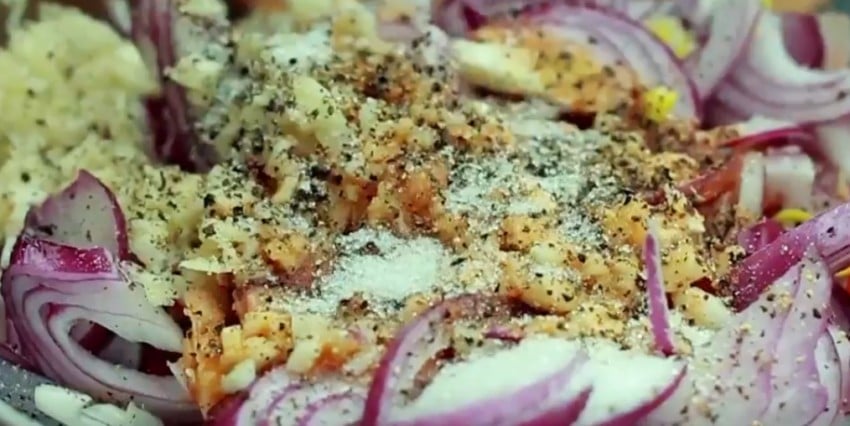 - Вынуть кусочки из маринада, промыть. Выложить их в глубокую емкость одним слоем, на него один слой лука, поперчить, полить 3 ст. л. подсолнечного масла.