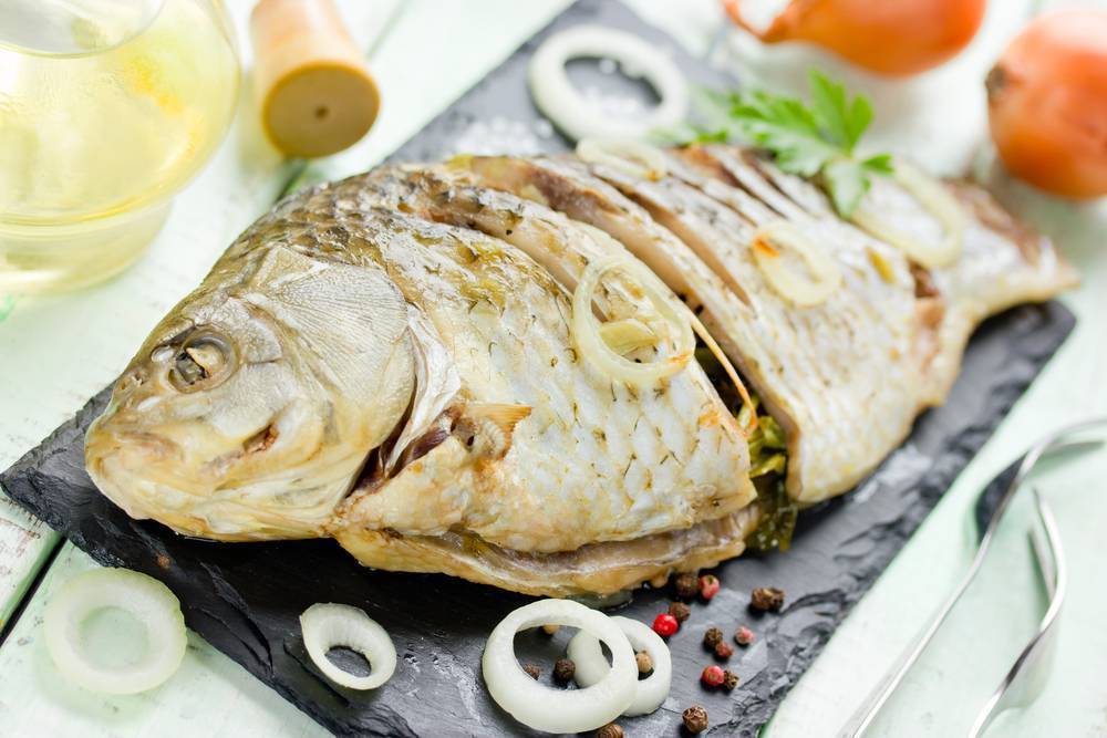 - Сазан — очень сочная рыба, поэтому к выбору специй и начинки следует подходить внимательно.