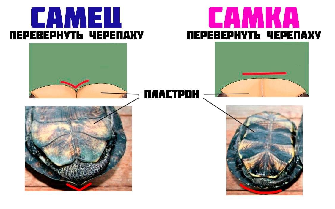 Чтобы определить пол красноухой черепахи посмотрите брюшную часть панциря (пластрон). У самцов — вогнута, у самок — нет.