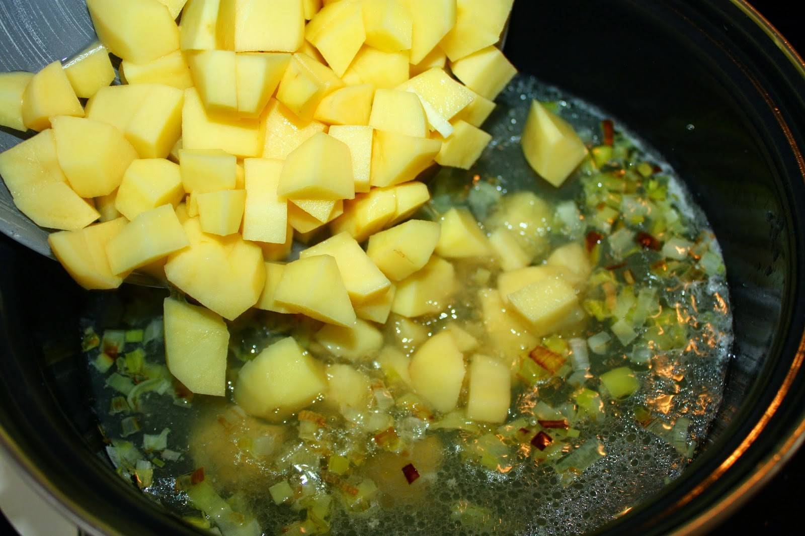 Бульон, напомню, тщательно процеженный, довести до закипания и отправить в него штук пять не очень крупных картофелин. Картошки надо резать не сильно мелко, но и не крупно. В общем, так, чтобы в ложку хорошо легло и есть было удобно.