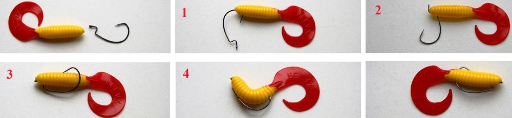 Методика насаживания твистера немного отличается от предыдущей и легче в исполнении, так как его форма более отчетливая по сравнению с виброхвостом. В первую очередь нужно ввести жало крючка в головную часть приманки и вывести ее в боковой части под углом 90 градусов.
