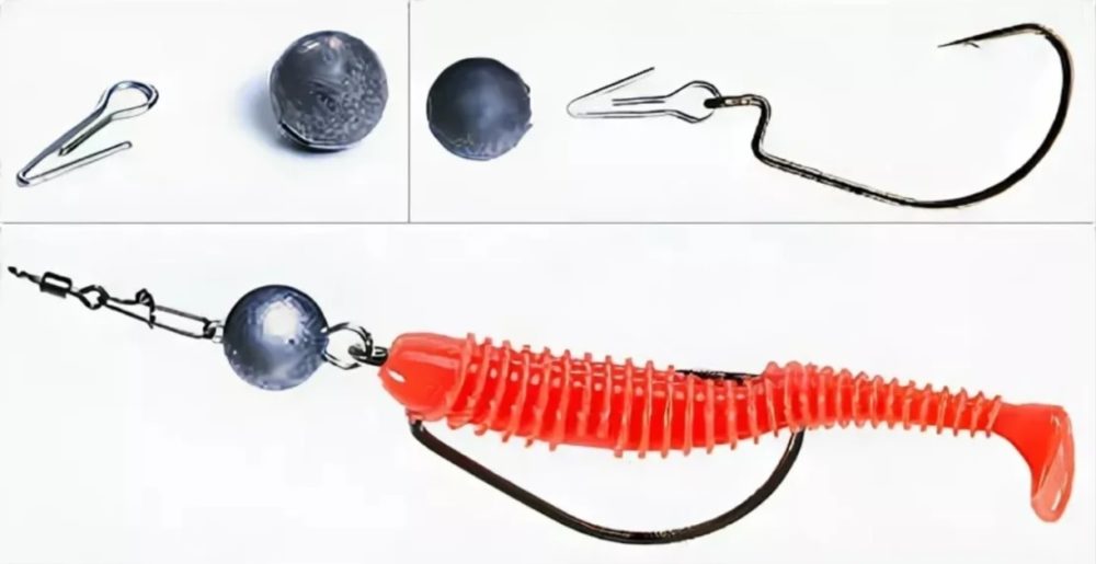 Чебурашкой принято называть разборную джиговую снасть, которая состоит из офсетника и грузила. При этом грузило имеет несколько ушек, откуда и пошло название «чебурашка». Для такого монтажа нужно взять офсетный крючок и натянуть на него силиконовую приманку. Далее через скрепку или с помощью заводных колец к нему цепляется «чебурашка», либо использовать разборный груз (см фото ниже).
