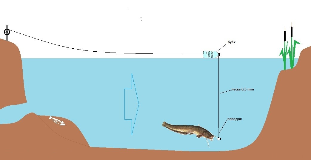 Такой способ отлично подойдет для ловли в камышах, где чаще всего «усатые» и водятся. При этом можно не бояться, что сом утащит снасти, так как баллон, используемый в качестве буя, спокойно удерживает даже крупных особей.