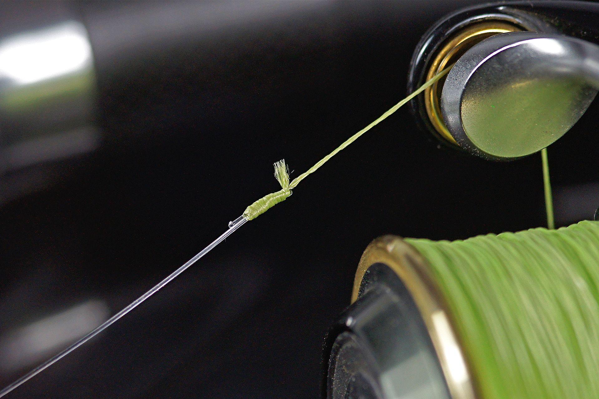 - Делаем плетеной леской 10 витков вокруг шок лидера, следим, чтоб не было захлестов.
