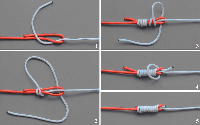 - Продеть конец главной лески в узел, затем протянуть на 15−20 сантиметров, обернуть главную леску вокруг плетеного шнура десять раз, двигаясь вперед при каждом обороте;